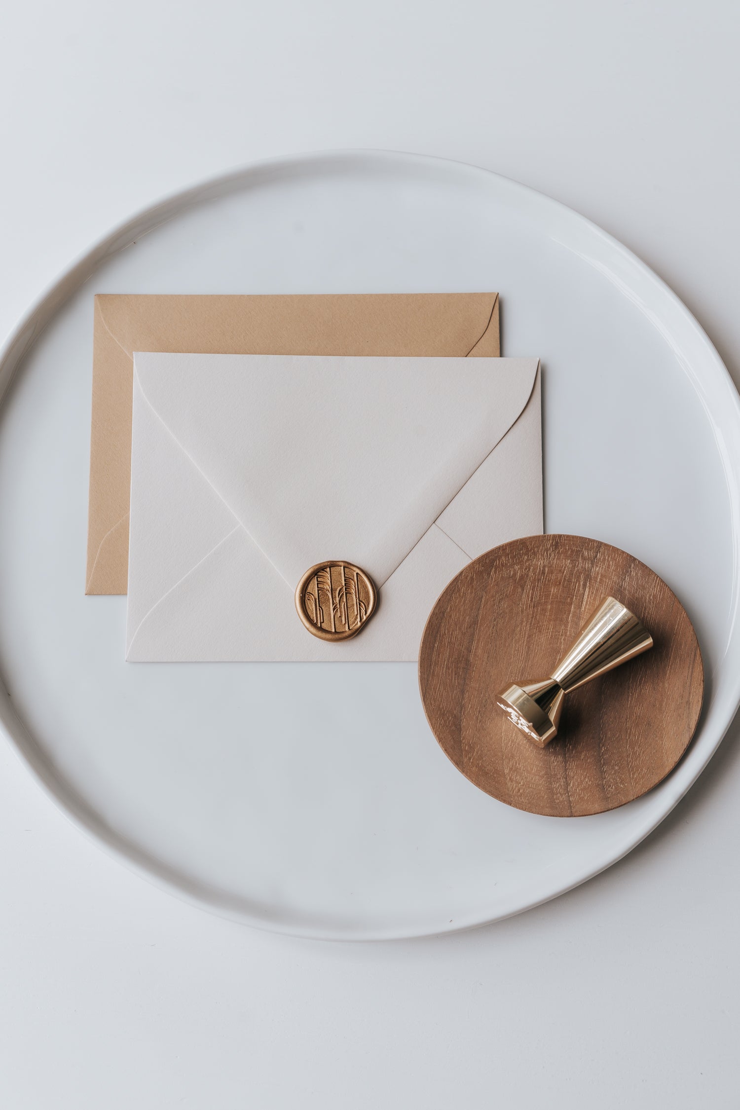 The wax seal set comes in a luxury off-white textured box with a mid-century modern brass seal engraved with modern arches and two gold wax seal sticks.