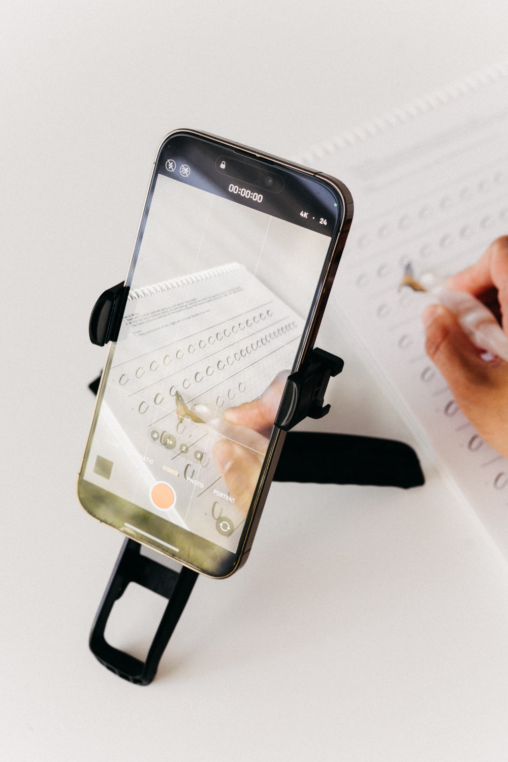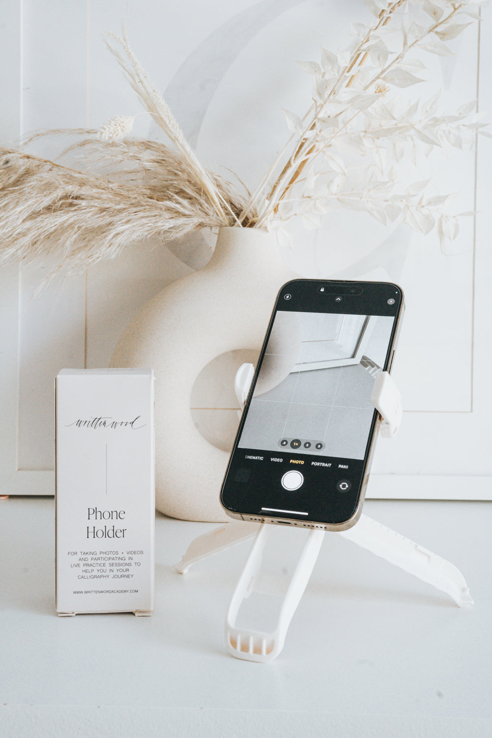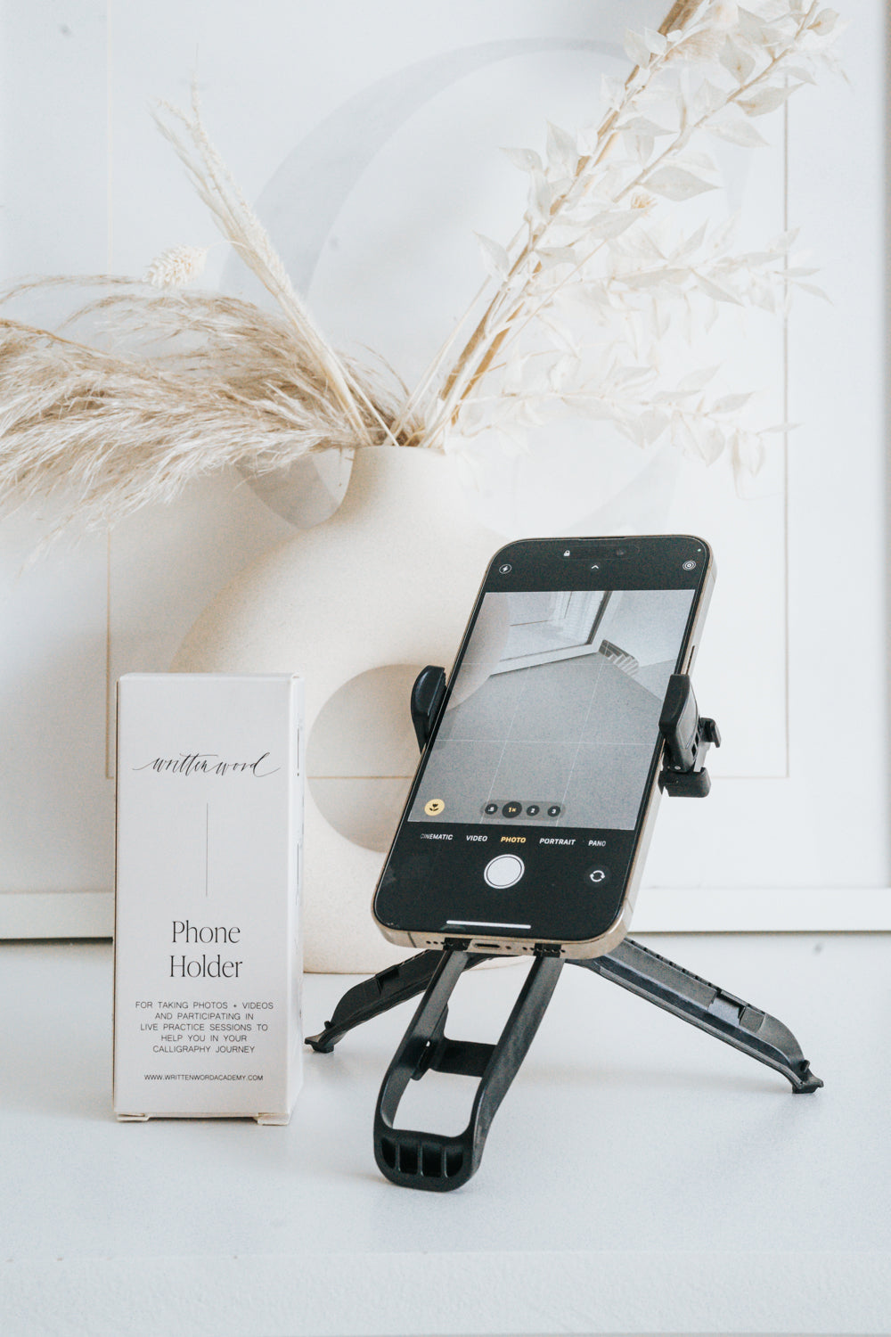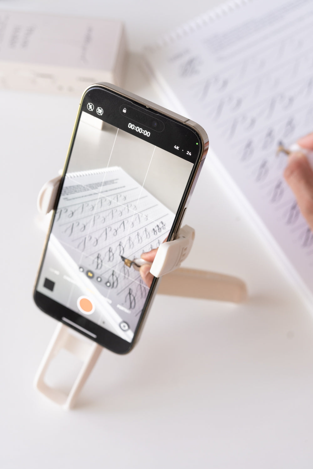 A small, foldable phone holder to help you take photos/videos while writing in calligraphy. Intended to be used during the Creative Calligraphy Course Premium Membership live practice sessions and for troubleshooting, but of course, feel free to use it otherwise!