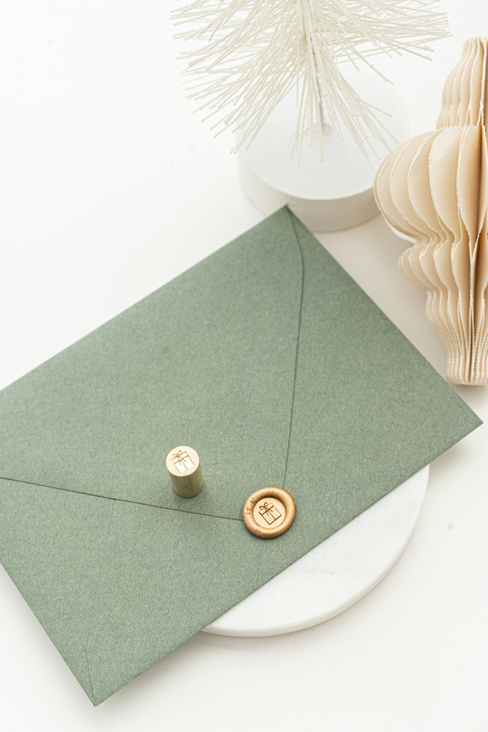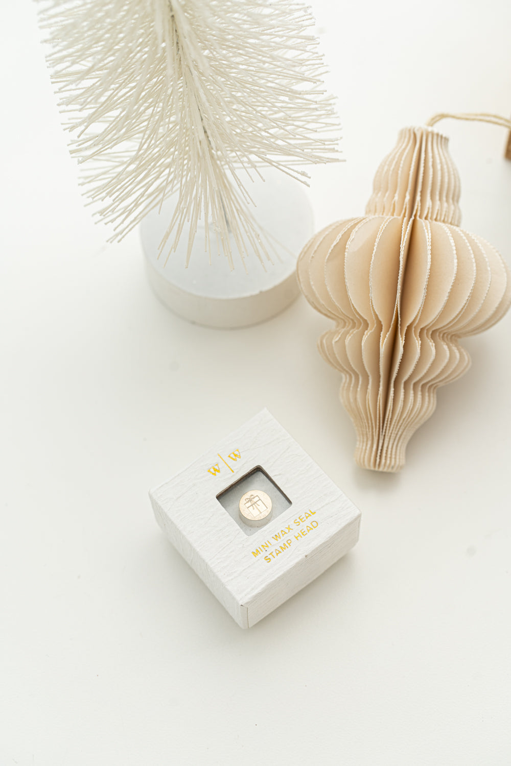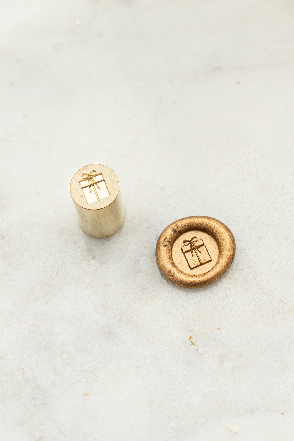 - 9mm diameter circle wax seal head with a 3d illustration of a wrapped present with a small ribbon bow