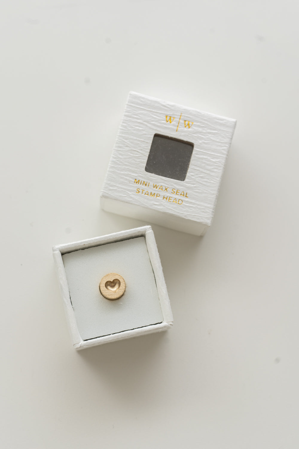 A 9mm Mini Wax Seal Head with 3d image of a heart. Packaged in a ring-style textured box. Intended to be used with our mini wax seal handle.