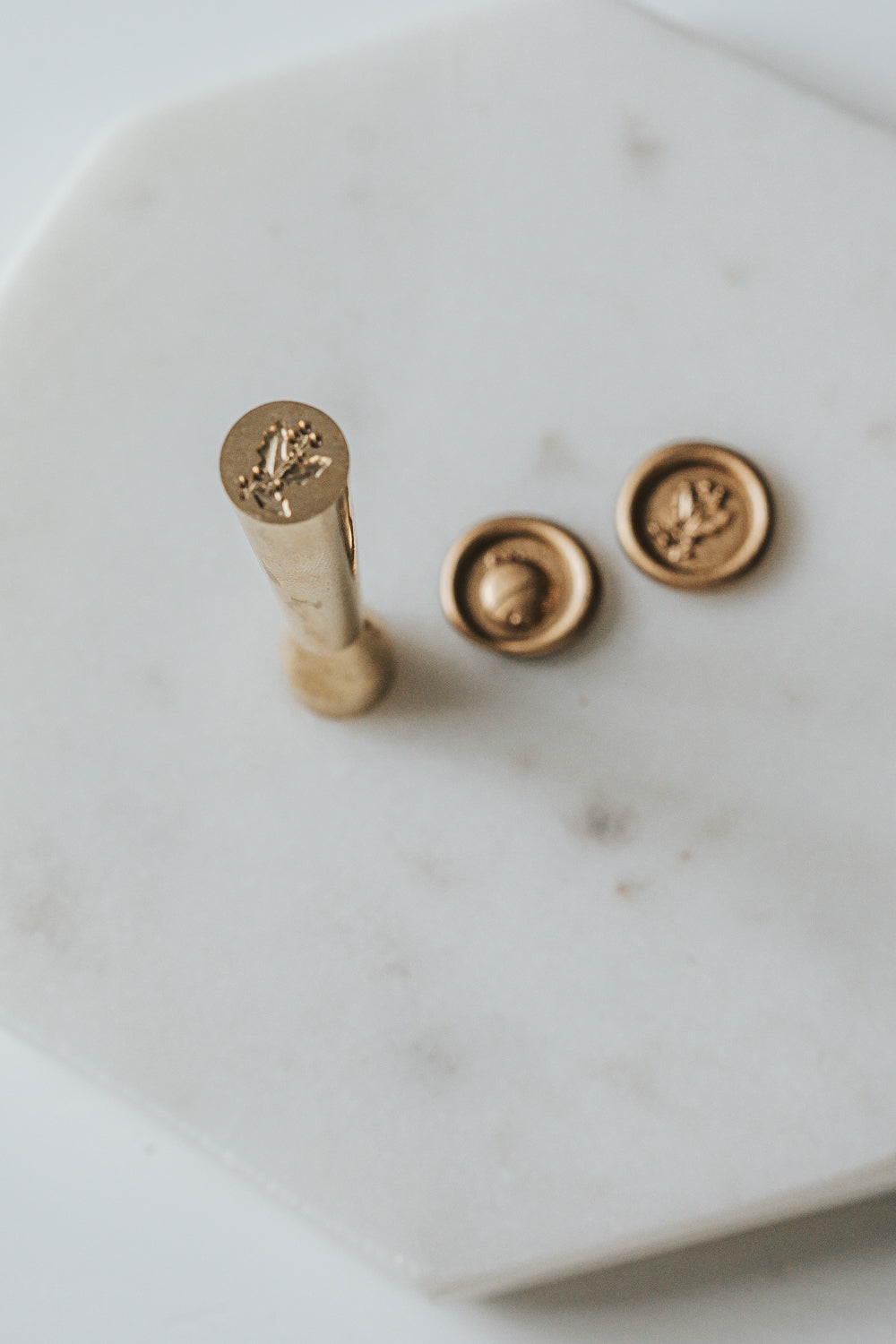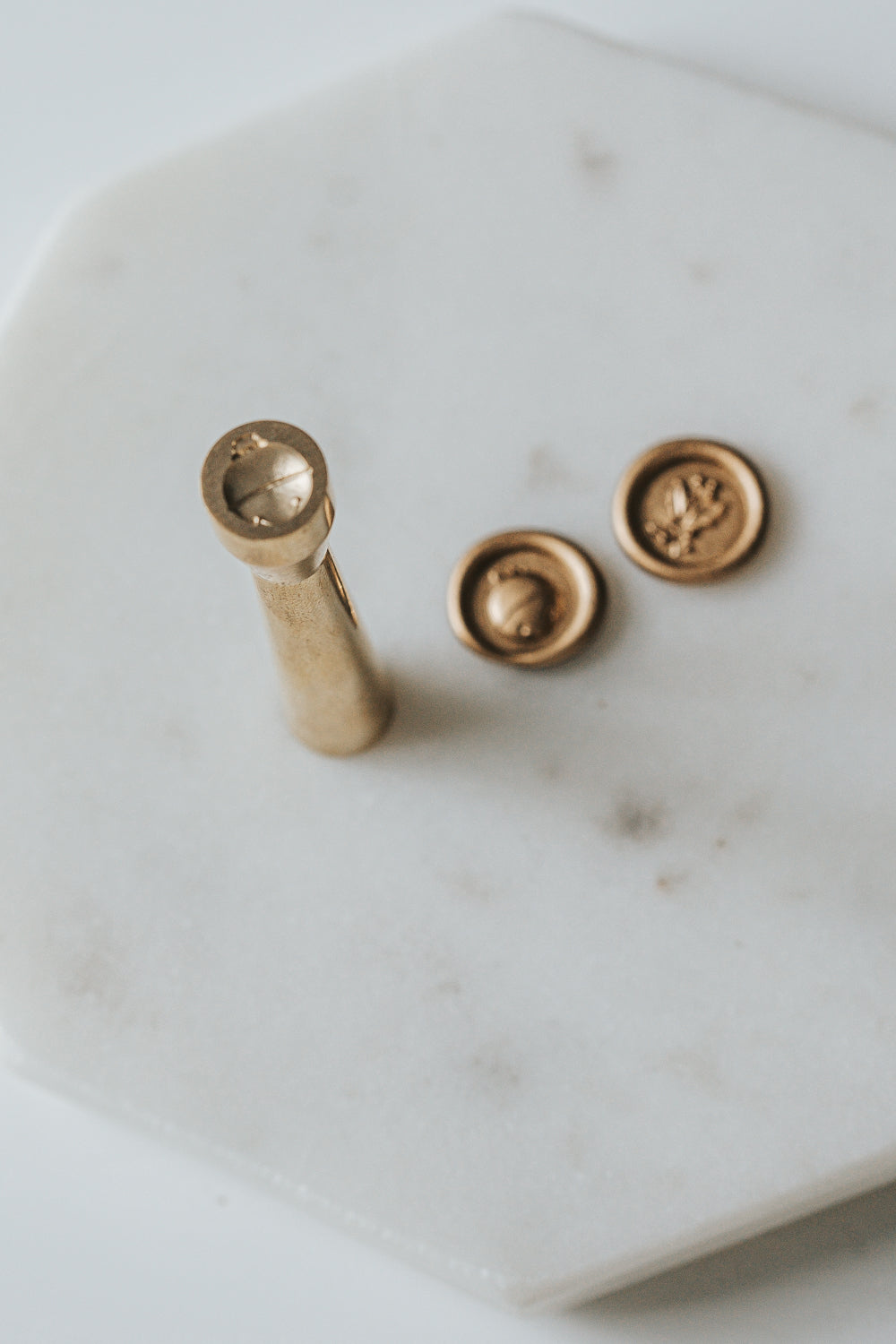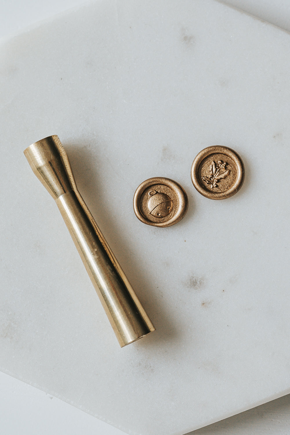 This miniature wax seal is in our signature mid-century modern brass shape, with two designs on each end - a Jingle Bell and Holly. The wax seal is 9mm in diameter.