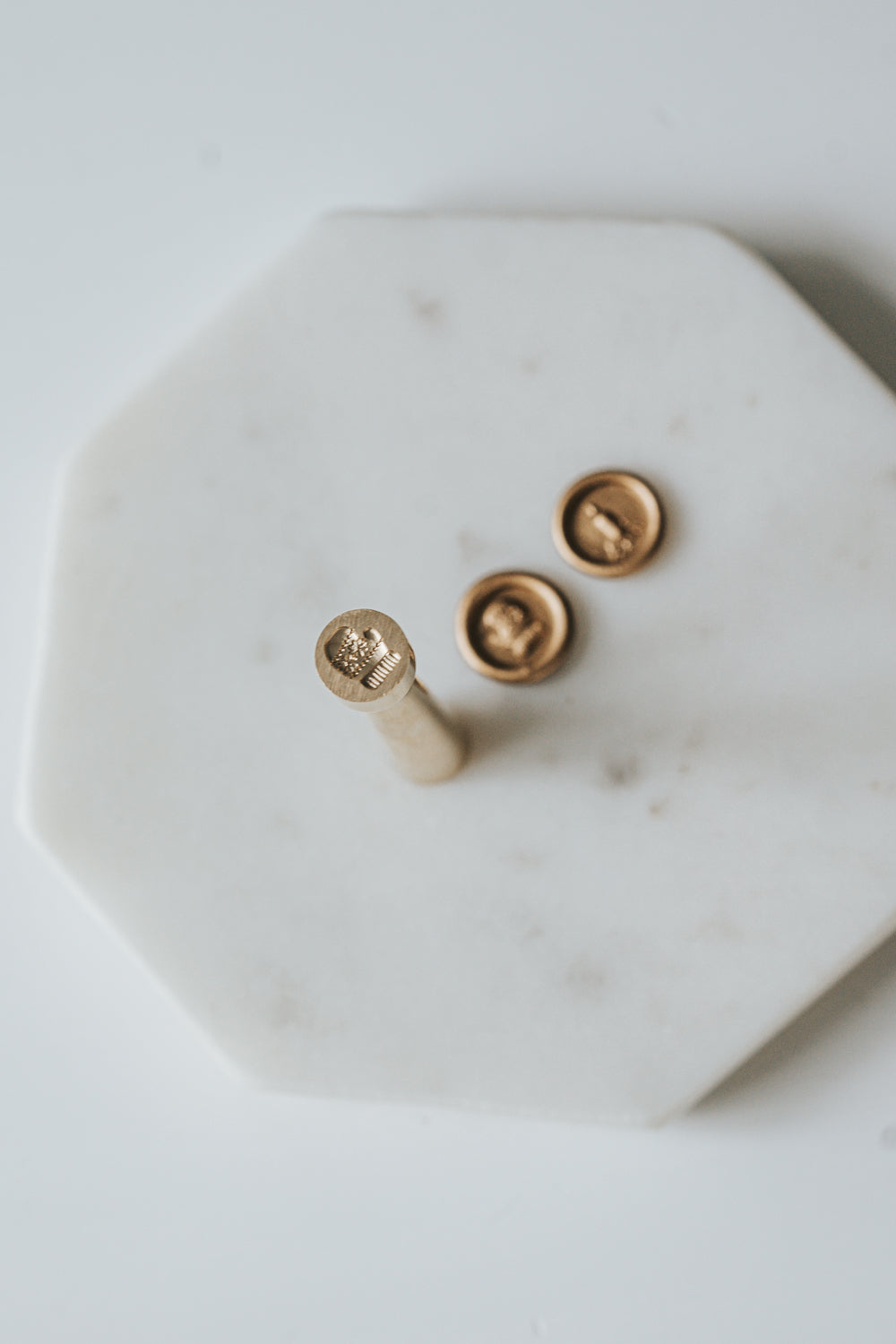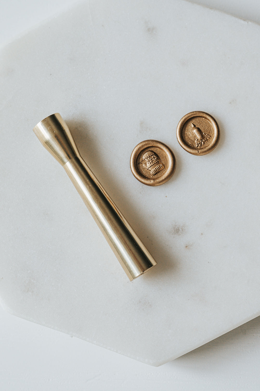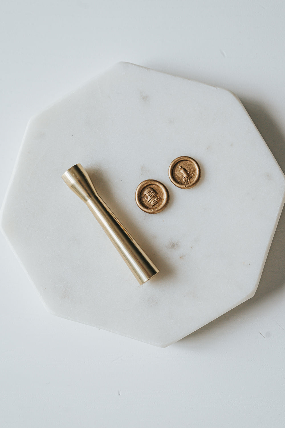 This miniature wax seal is in our signature mid-century modern brass shape, with two designs on each end - a knitted mitten and an Advent candle with a simple wreath underneath it. The wax seal is 9mm in diameter.
