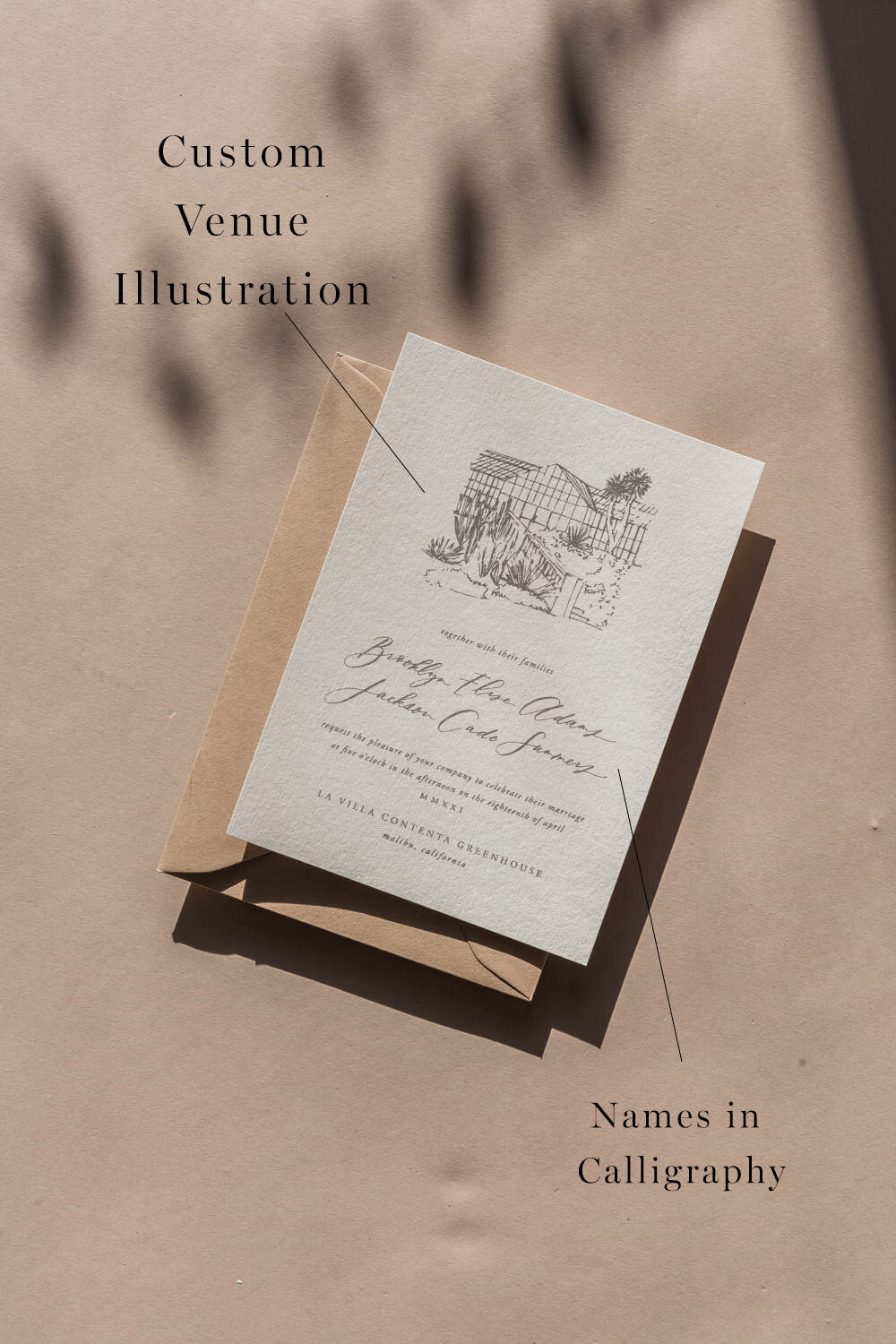 This 2-piece suite includes the Main Invitation, Main Envelope and Return Address Printing. The type of printing chosen will also be the type of printing used for the envelopes return addressing. This suite does not include calligraphy envelope addressing.