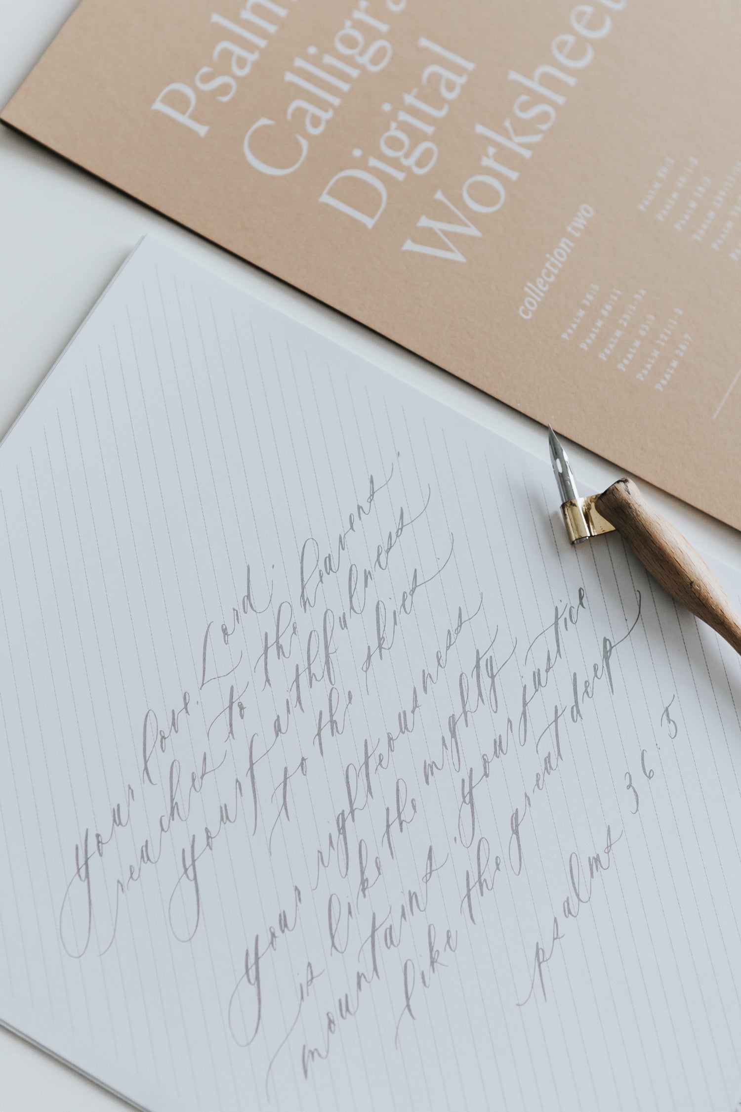 The worksheets feature an instruction guide, 12 Psalm excerpts on 8.5x11 sheets with tracing and slant lines, and the same Psalms in images to be used on Procreate on the iPad. The intention of these worksheets are for practicing to increase muscle memory for writing in calligraphy. An added bonus is that this is an amazing way to relax and meditate on God’s word while practicing. Calligraphy supplies are not included in this digital file
